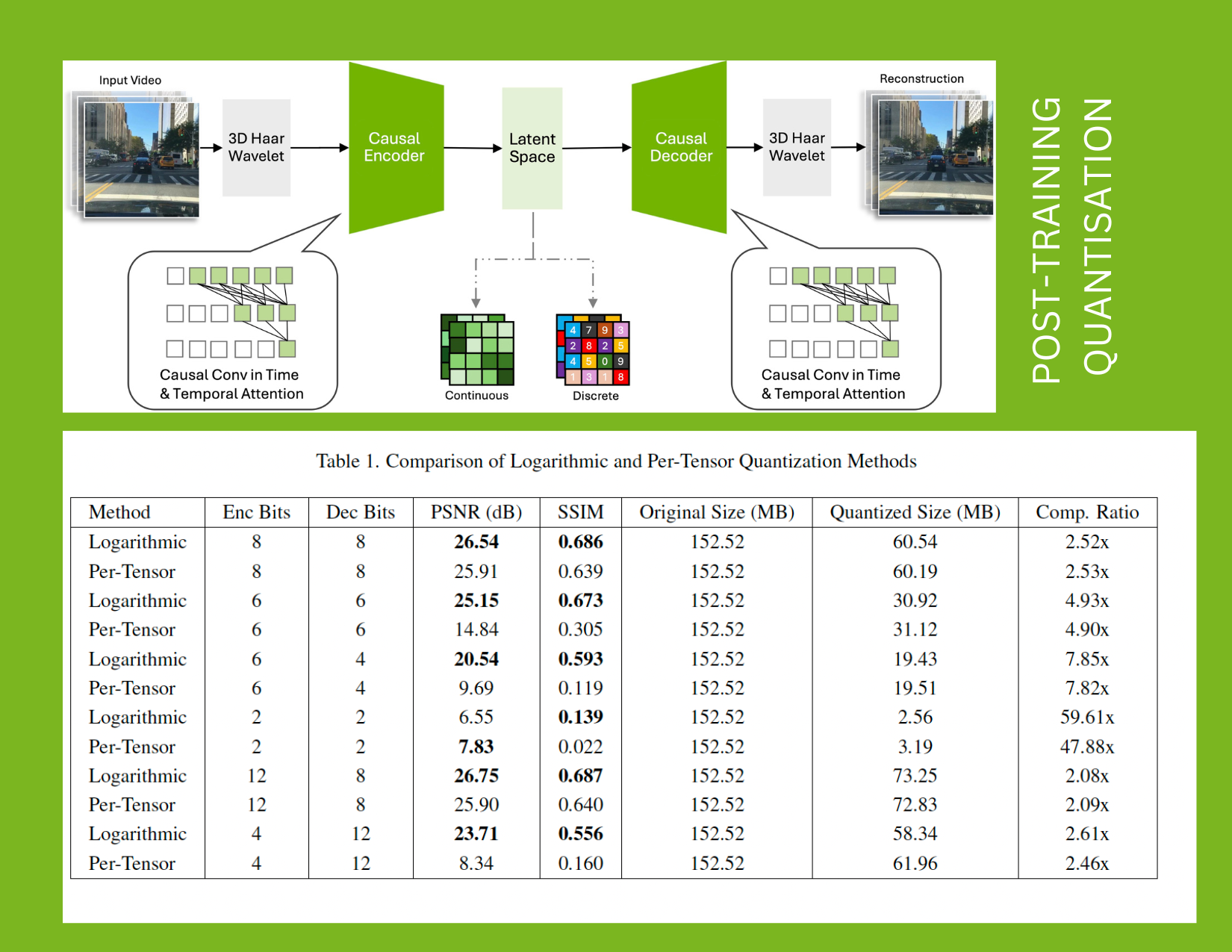 Implemented PTQ techniques like logarithmic and per-tensor for the Cosmos tokenizer, showing logarithmic quantization's superior performance (25.15 dB vs 14.84 dB PSNR at 6-bit), while achieving up to 7.8× model size reduction through asymmetric encoder-decoder compression without sacrificing image fidelity.